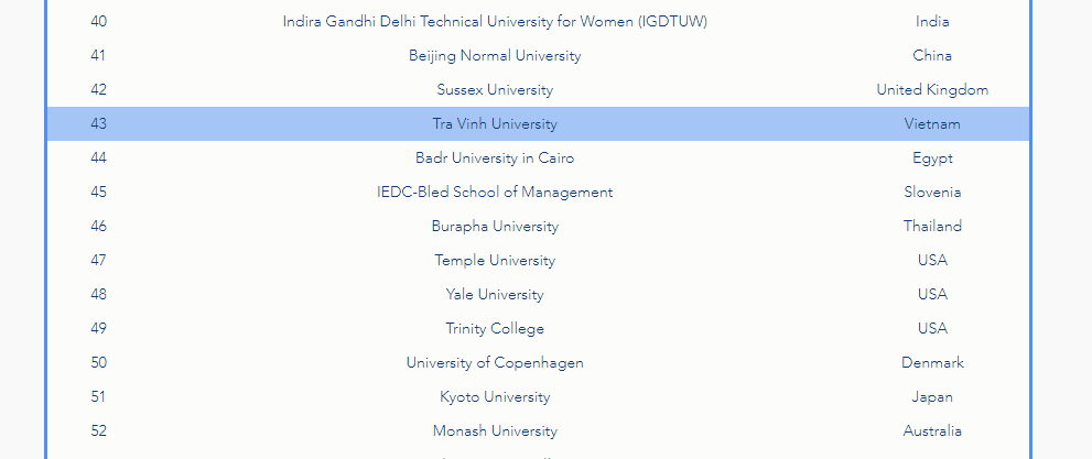 Trường Đại học Trà Vinh xếp hạng 43 – tăng 19 bậc so với năm 2022, tiếp tục tăng hạng trong Top 100 của các trường có ảnh hưởng và đóng góp